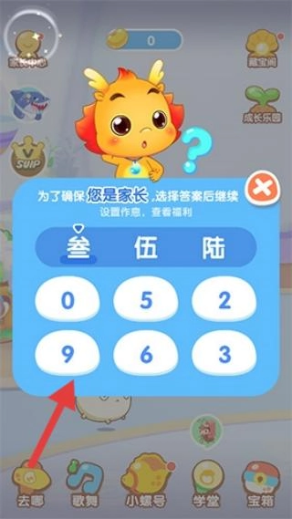 1、在首页弹出的家长验证界面中,点击数字按钮并选择对应答案,完成验证后即可进入后续操作环节。