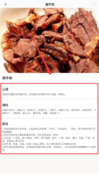 2、找到心仪的菜谱,诸如酱牛肉这类,记得先把用料和心得看仔细,按照详细步骤来操作,成功率会更高呢。