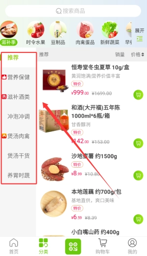 4、进入分类页面后,可按商品类型分类浏览,便捷筛选所需生鲜商品,提升选购效率。