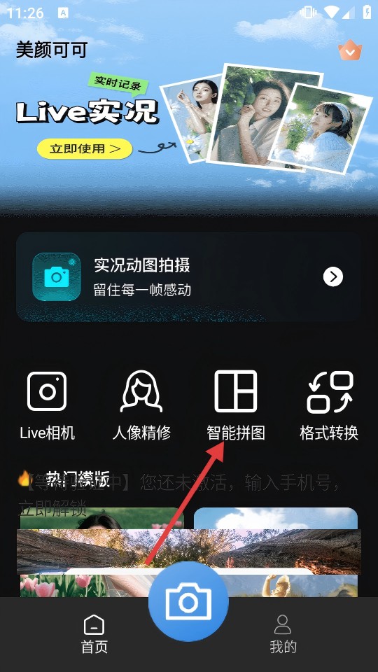 1、打开“美颜可可”首页,点击【智能拼图】,进入相机胶卷选择图片。