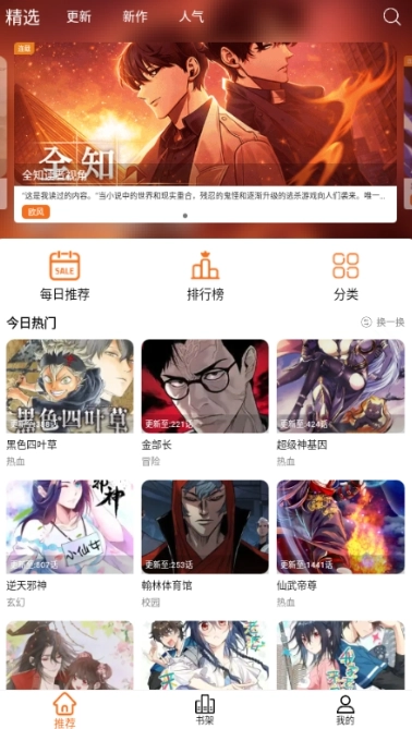 书架管理与更新提醒功能:可以把感兴趣的漫画添加到书架,便于之后继续阅读;更新效率高,并且有多个漫画源作为保障,能有效防止断更问题出现。