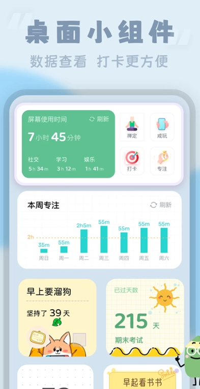 添加桌面小组件后,不用打开应用就能查看任务进度和专注数据,使用起来更便捷。