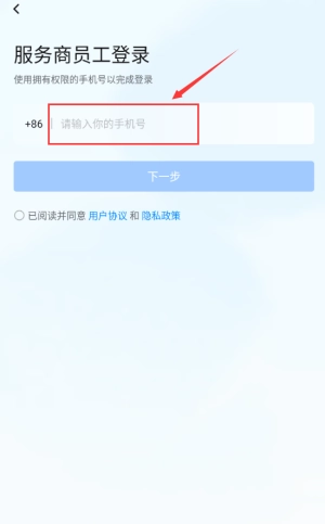 点击红框服务商登录,选择手机号登录方式。