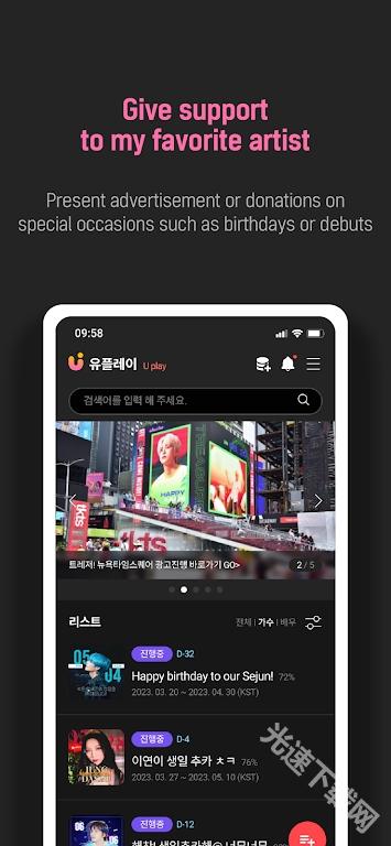 为你最喜欢的偶像加入公众众筹活动,发布广告或在特殊场合(如生日或出道纪念日)为你的偶像捐款,并与朋友一起完成融资。