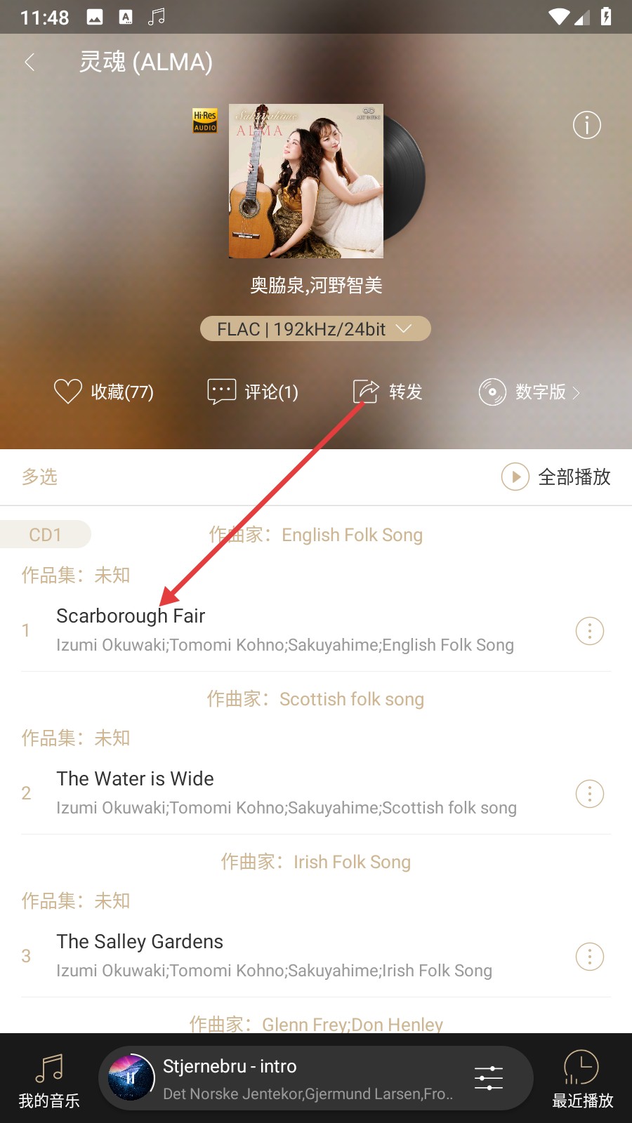 2、在专辑曲目列表中,点击《ScarboroughFair》歌曲,进入播放页面。