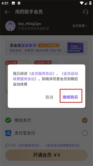 4、在协议确认弹窗中,点击【继续购买】按钮,可进入后续的会员开通支付流程。