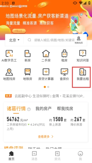 2、进入应用首页,点击【我要出租】按钮,进入房源发布流程。