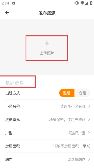 3、在【发布房源】页面,先点击【上传照片】添加房屋图片,再填写【基础信息】,包括出租方式、小区名称、户型、房屋面积、朝向等内容,完善信息以便顺利发布房源。