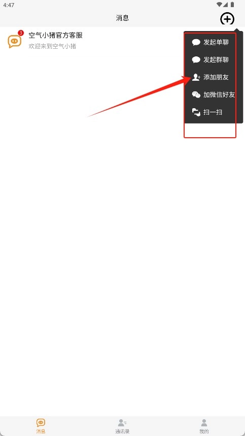 3、在客服聊天界面点击右上角“加号”弹出添加朋友选项即可完成操作。