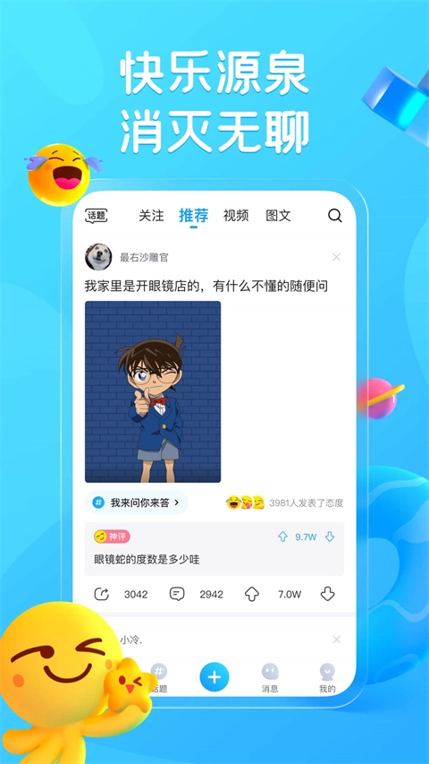 文字、视频、图片,百万种表达方式任你挑选。火爆神帖、爆笑GIF图,让你笑出腹肌!