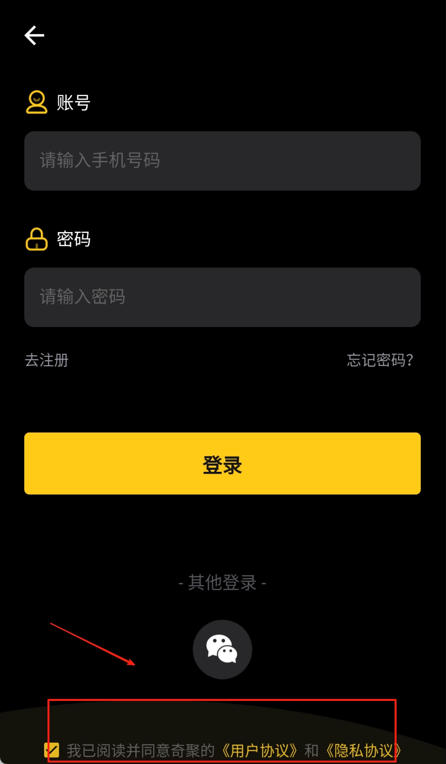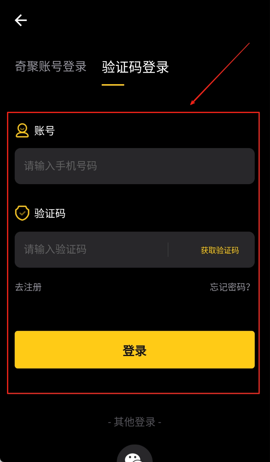 打开软件后会进入黑底的登录页面,接着点击顶部的选项来挑选登录方式,再按照提示在对应的输入框里填写手机号和密码,最后点击黄色按钮就能完成登录啦。