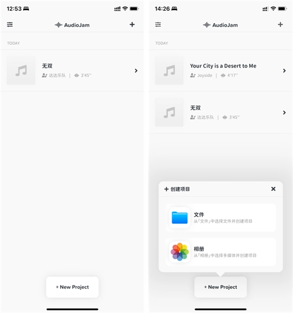首先要打开App,接着点击「+」按钮创建新项目,这一步需要从「文件」里导入音频文件,支持的音频格式有.mp3、.m4a、.aac、.aiff、.wav,同时也支持.mp4、.mov格式的视频文件。完成导入操作后,系统会自动将其生成一个工程项目,此时能看到音频文件已成功导入,并且在播放控制页面可以查看对应的波形图。