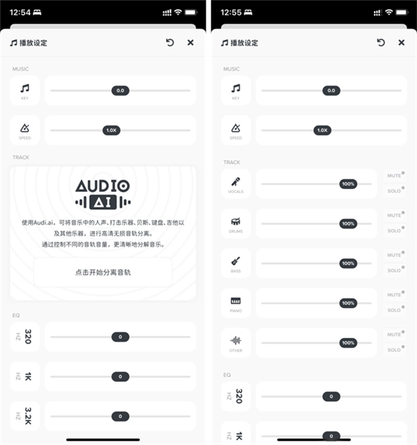 若要对当前播放的音乐进行音轨分离,需点击界面右上方的「播放设定」选项。进入设定页面后,在「TRACK」分类下可找到「AUDIO AI」功能,该功能借助人工智能技术,能更高效地实现乐器音轨的精准分离。点击启用此功能后,系统会将当前音频文件上传至云端服务器进行智能分析处理,待分析完成后,生成的多个独立音轨会自动回传至本地设备,从而完成音轨分离操作。
