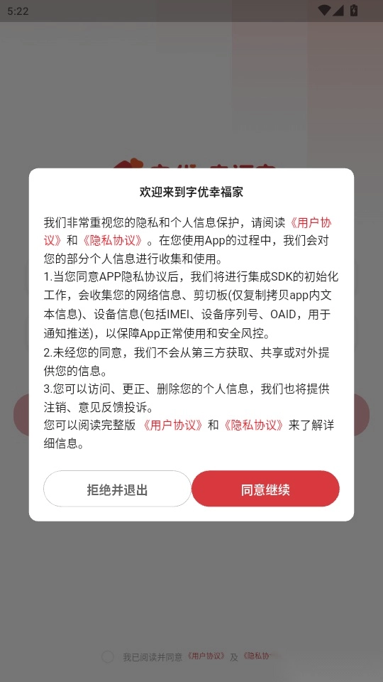 打开软件后,阅读“用户协议”与“隐私协议”,点击“同意继续”按钮即可进入。