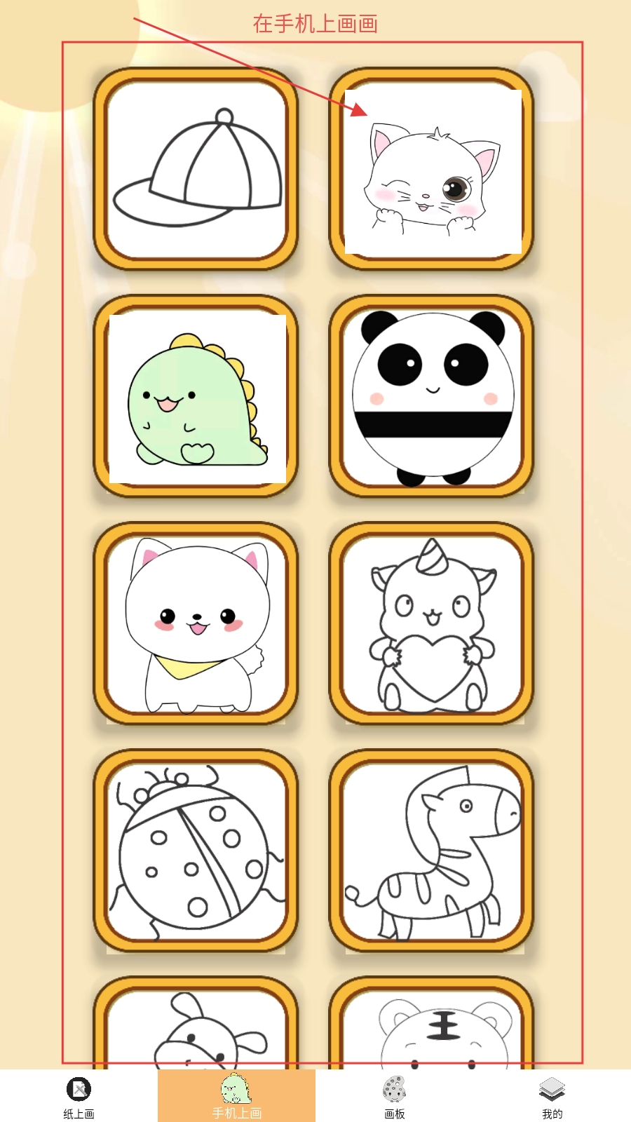 打开应用后,进入【在手机上画画】页面,选择你想要临摹的图案(比如猫咪图案)并点击选中,随后就能进入绘画环节了。
