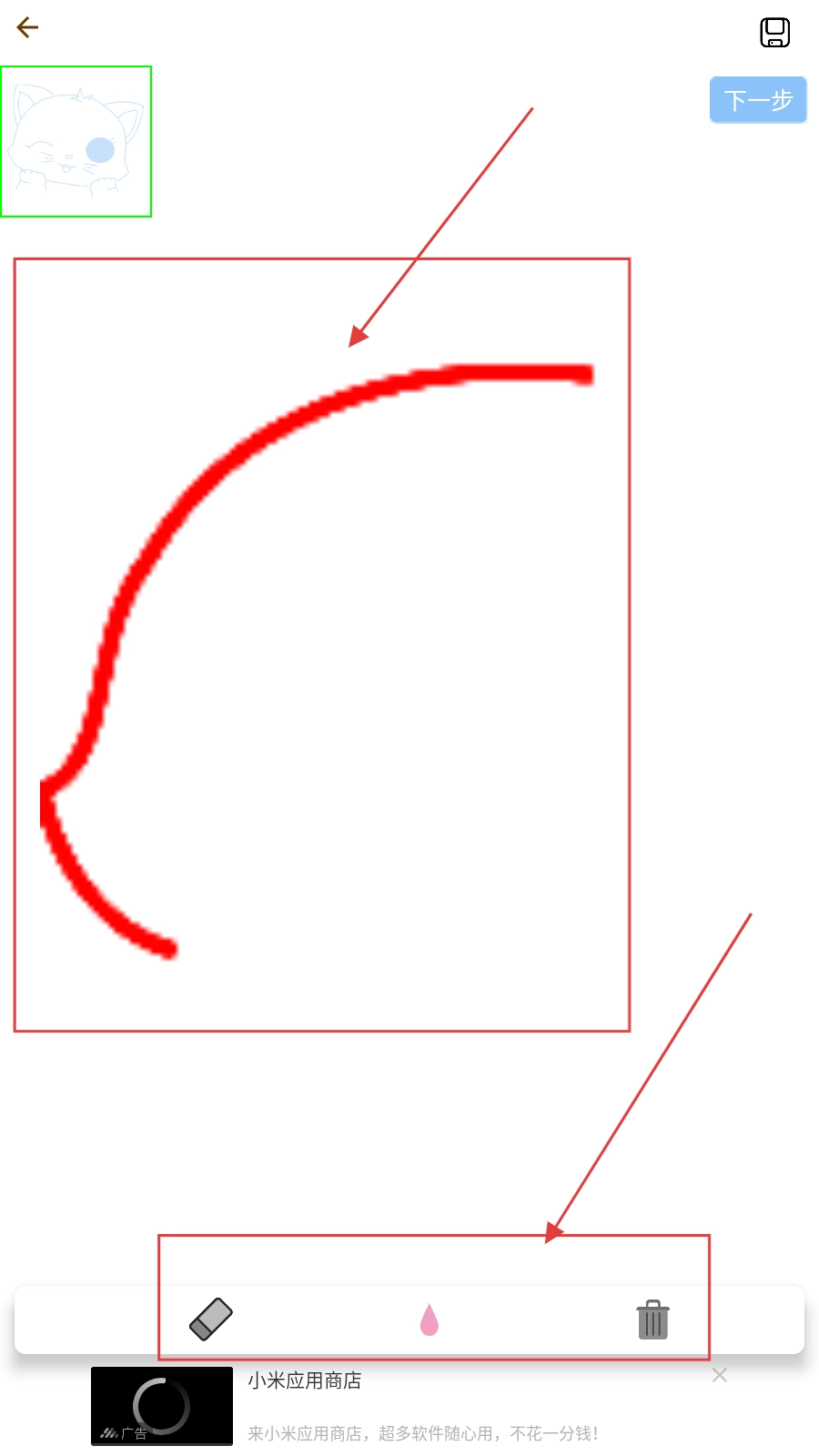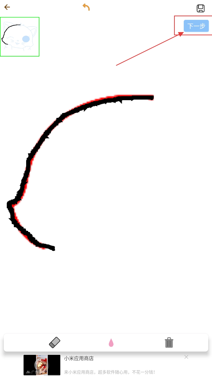 在绘制过程中,借助工具进行调整,完成当前这一步骤后,点击右上角的【下一步】按钮,不断推进绘制进程,把图案完整地临摹到画布上,从而完成绘画任务。