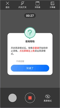 录像取证同样具备这种模式,而且该模式的操作方式非常简便:通过手机的音量键就能切换录像的开始与停止状态,若要退出黑屏模式,只需点击手机假黑屏界面的左上角即可。