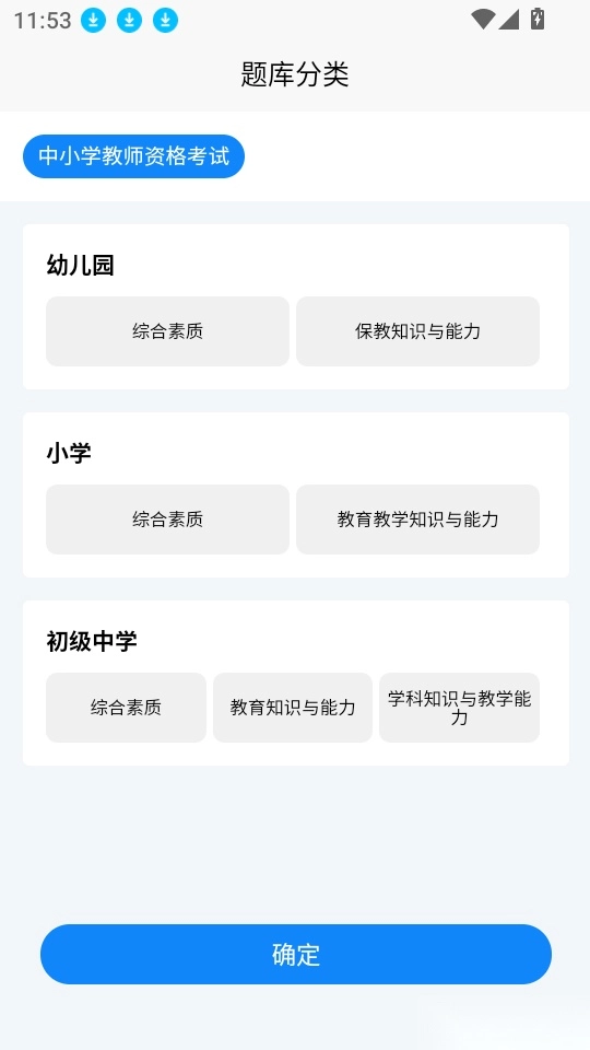 进入题库分类界面后,就能按分类挑选所需的题库,点击“确定”按钮即可进入下一步操作。