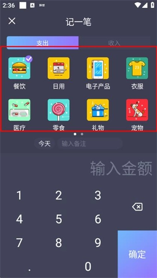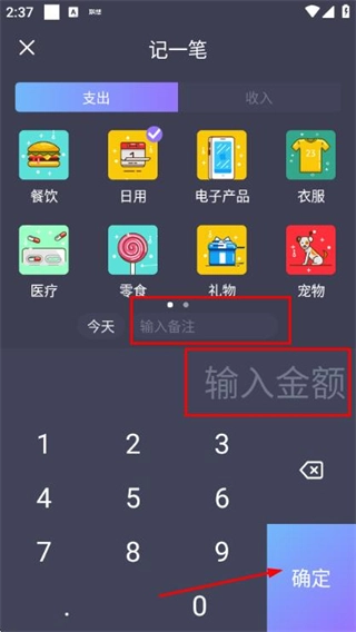 在记账信息填写页面输入备注和金额,接着点击确定按钮,即可完成此次记账操作。