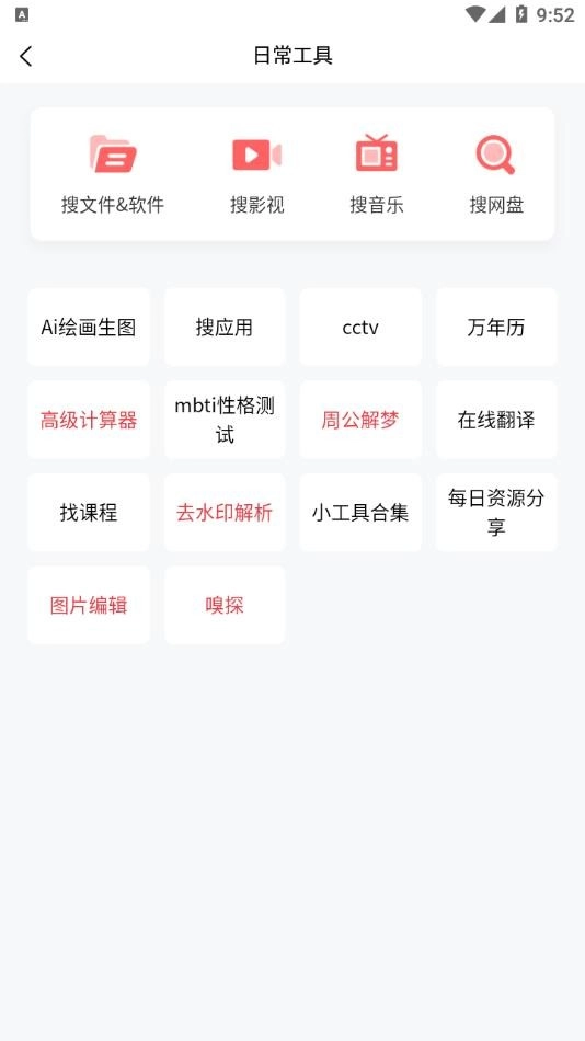 日常工具区包含搜文件、搜影视这类高频使用的功能,另外还有去水印解析、图片编辑之类的小工具。