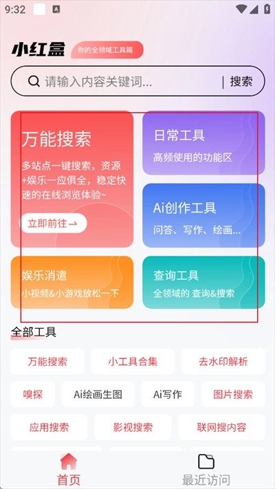 小红盒是一款工具丰富的实用软件,万能搜索、AI生图、音乐查找、游戏娱乐、视频观看、资源嗅探、文件搜索、直播浏览等多领域功能,覆盖日常使用的各个场景,为用户提供一站式服务体验,无需在多款应用间来回切换,操作便捷高效。有需要的朋友,可直接在本站使用这款软件哦。