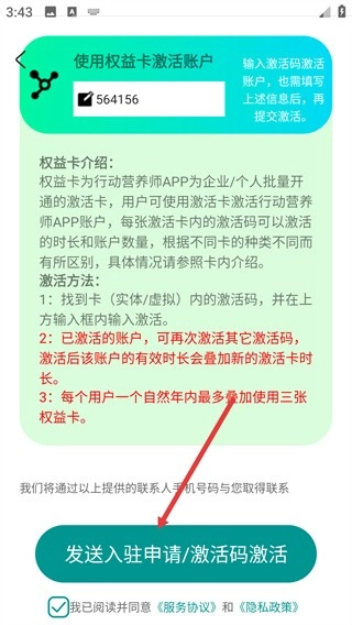 4、在权益卡激活页面输入激活码,勾选相关协议后,点击【发送入驻申请/激活码激活】按钮,即可完成账户激活流程。