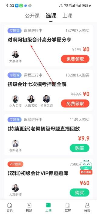 2、进入上课页面后,点击选课选项,即可切换至课程领取的展示列表页面。