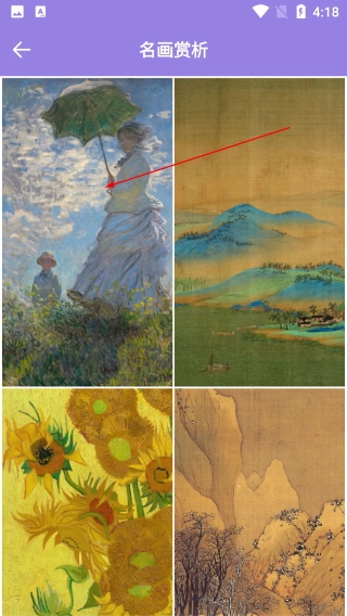 3、进入【名画赏析】页面,能查看多类风格的经典画作(如印象派-传统山水类作品),点击对应画作可进入详情页查看细节。