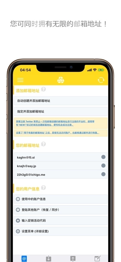一次性邮箱是一款无需注册就能获取临时邮箱地址的应用,用户可以同时持有多个邮箱地址,方便分开使用,而且这些邮箱地址没有有效期限制,能够长期使用。