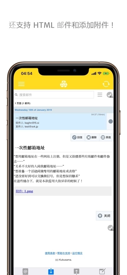 还可收发附件。 应用会自动屏蔽危险文件。