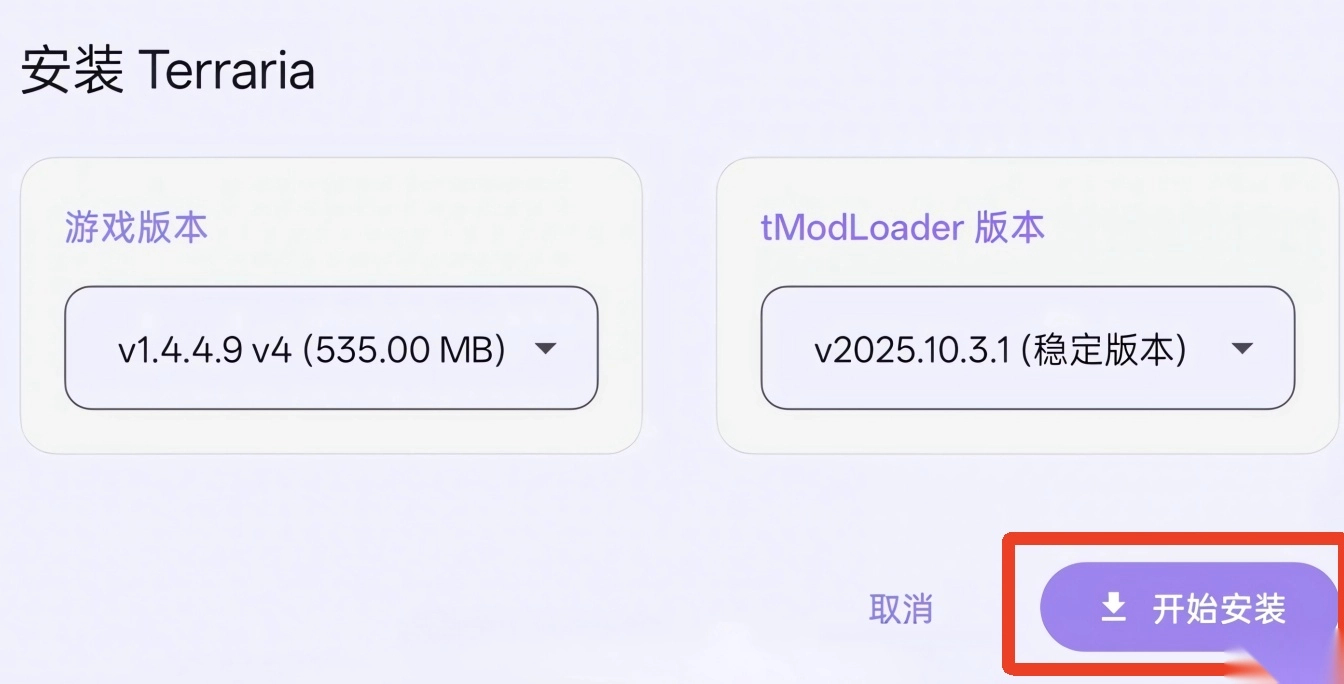 在Terraria的安装页面中,点击右下角的【开始安装】按钮。