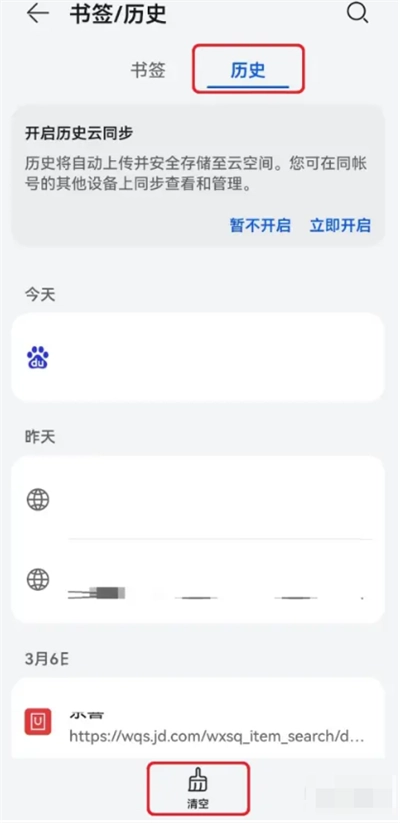 3.在书签/历史页面的历史栏列表中,点击【清空】按钮。