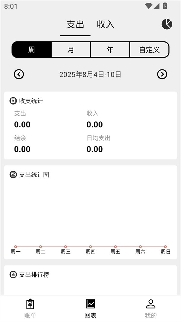 3、来到“图表”页面,用户可以直观看到每周、每月甚至每年的支出或者收入的统计图表。