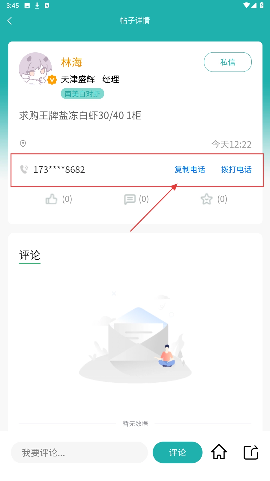 在分类页面点击需求类帖子(例如林海发布的求购虾的帖子),可以查看具体详情以及联系方式。