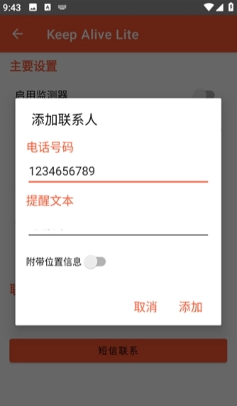 6.添加联系人的电话号码、提醒文本,点击“添加”