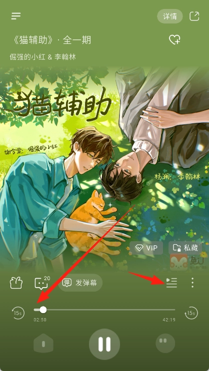 5. 使用底部进度条调整播放进度,右侧设置播放速度、定时关闭和音效。