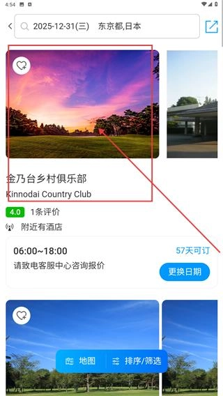 2、在搜索球场页面,选择热门目的地(如“东京都·日本”),进入对应地区的球场列表。