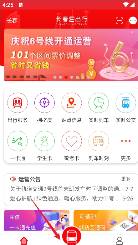 1、启动长春e出行App,进入用户首页,登录账号后,点击页面下方的“乘车码”功能选项;