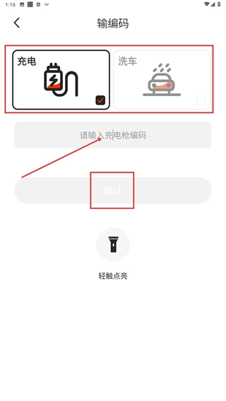 4、在输编码页选择【充电】功能,填写【请输入充电枪编码】后,点击【确认】按钮完成操作。