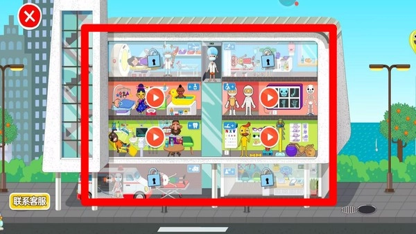 关卡选择界面集中呈现医院的不同科室楼层,涵盖儿科、牙科、眼科等多个主题房间,可自由点击进入体验。