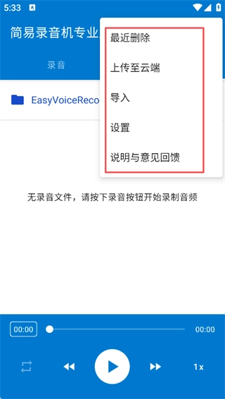 5、点击右上角的菜单按钮,就能选择【最近删除、上传至云端、导入】等功能,便于对录音文件进行管理。