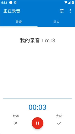 2、点击录音按钮后进入【录音】状态,界面显示录制时长,可通过【暂停、取消、完成】按钮控制录音流程。