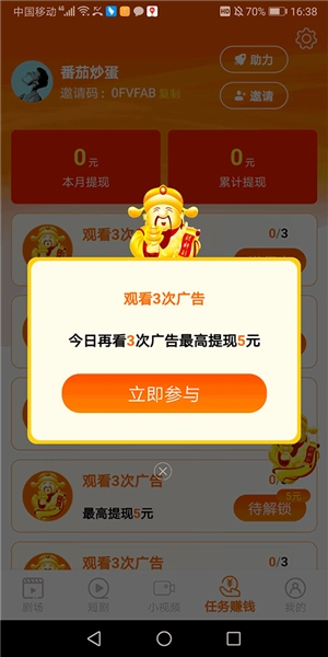新人用户登录后可观看广告领平台现金,任意页面点右侧财神看广告参与活动,频繁看视频获额外红包,完成任务且在个人账号页实名认证后自动打款到微信,无门槛套路收益每日可见,还能邀请好友提现赚红包收益且邀请越多收益越多。