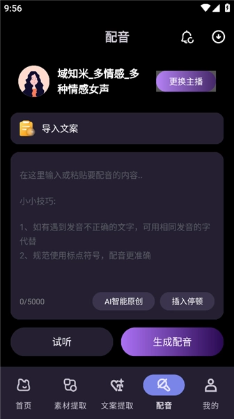 提供多情感女声,支持导入文案,有 AI 原创、插入停顿功能。