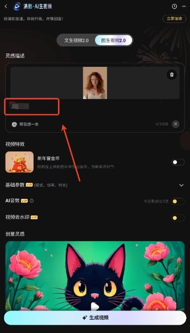 3.点击图生视频,上传图片。同时你可以描述一条你希望这张照片所ai成的样子
