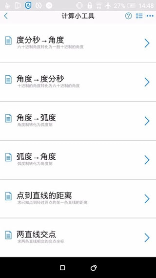 角度与距离计算功能:计算小工具中集成了多种角度和距离相关的计算工具,能够完成度分秒与角度的相互转换、角度到弧度的转换,以及点到直线距离的计算等操作,使用起来十分便捷。