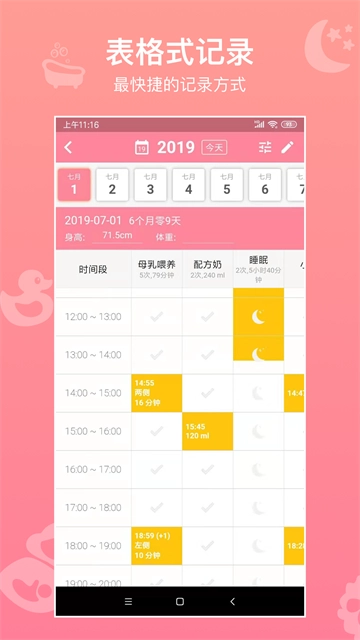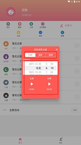 它还支持记录宝宝的身高和体重。系统将自动生成生长曲线,并支持测量数据的管理。它还支持记录每天宝宝的喂养时间。