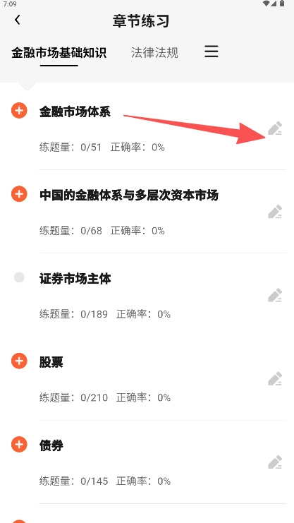 在章节列表里找到你要练习的目标章节,比如“金融市场体系”,点击对应的编辑图标就能开始练习了。