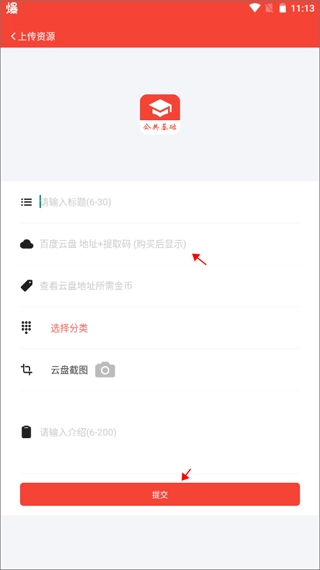 先确定一个和你的资源相匹配的名称,准备好百度云盘的链接与提取码,输入购买所需的金币数量,再填写一些文字介绍,之后点击提交即可;上传成功后,就能在“我的上传”中查看对应的上传记录。