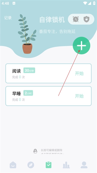 在自律锁机页面,点击右上角的【+】按钮,即可进入编辑习惯的设置页面。